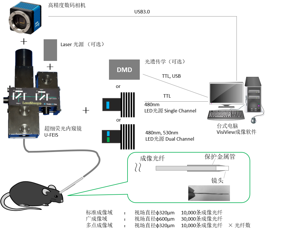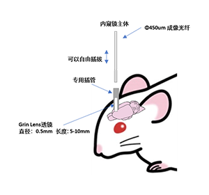 The LumiScope in vivo microscope uses an ultra-fine optical lens with a diameter of 350 μm and 10,000 imaging fibers arranged in an array to perform experiments with a variety of fluorescent proteins and fluorescent calcium indicators, as well as light-sensitive proteins such as ChR2 and NpHR, to achieve spatial resolution in the 2 μm range. The activity of specific nerves can be controlled by optogenetic stimulation.