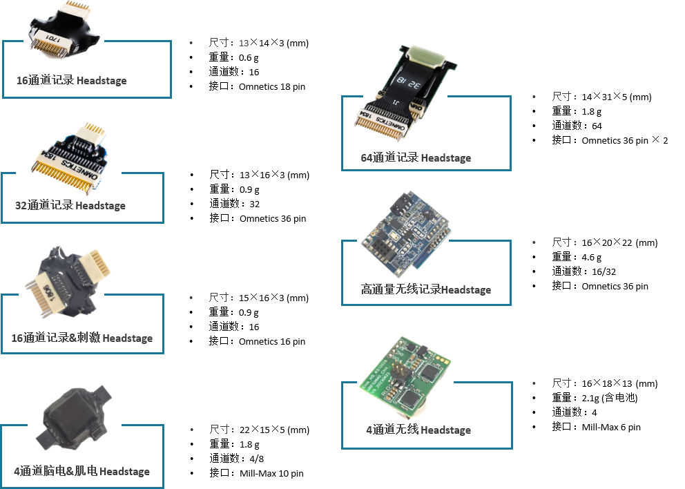HeadstageBio-Signal offers a wide range of miniature wired and wireless digital headstages designed for extracellular electrophysiological recordings, including single-cell discharge, local field potentials, cortical electrodes, EEG, and EMG.